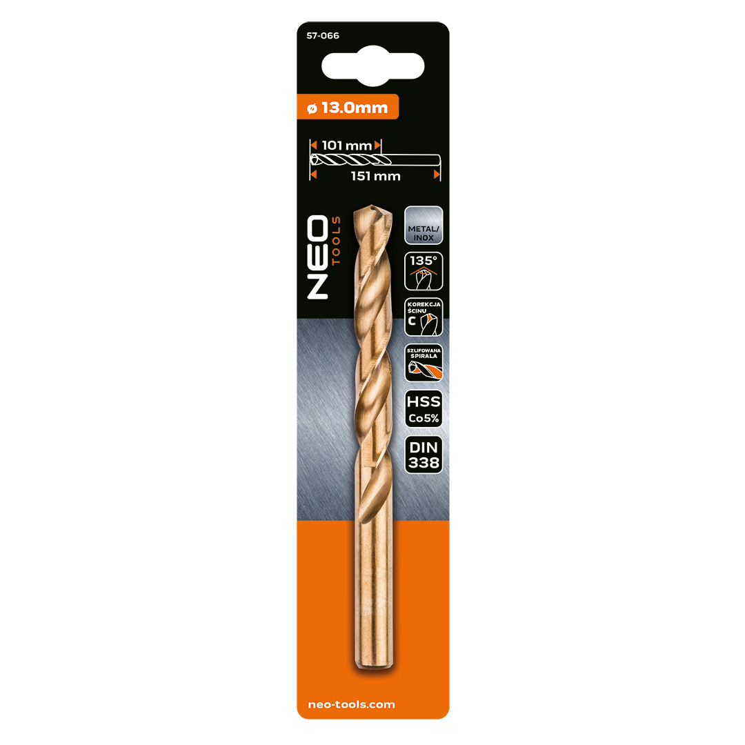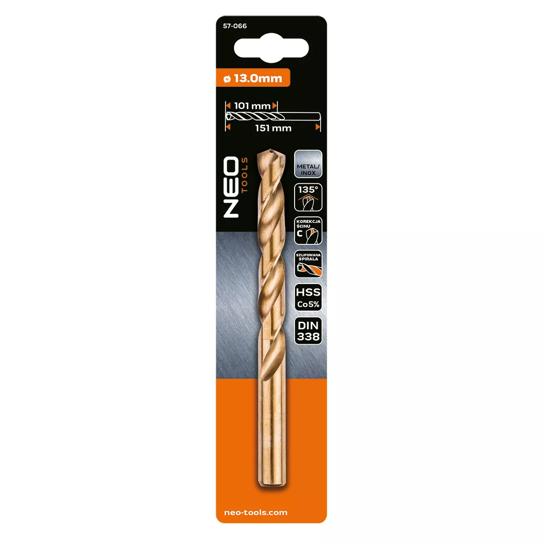 Wiertło do metalu HSS-Co 13.0 mm, 57-066 marki NEO TOOLS to wiertło głęboko szlifowane zgodnie z normą DIN 338 i wykonane ze stali M35 z 5% dodatkiem kobaltu. Zastosowano w nim kąt wierzchołkowy 135° oraz korekcję ścinu typu C. Posiada uchwyt cylindryczny. Długość części roboczej wynosi 101 mm, a jego długość całkowita to 151 mm. Maksymalne prędkości obrotowe wynoszą: INOX 275-300 obr./min, metale ogólne 550-600 obr./min. Przeznaczenie tego wiertła marki NEO TOOLS to wiercenie w materiałach wymagających, takich jak stal nierdzewna, kwasoodporna i żaroodporna.