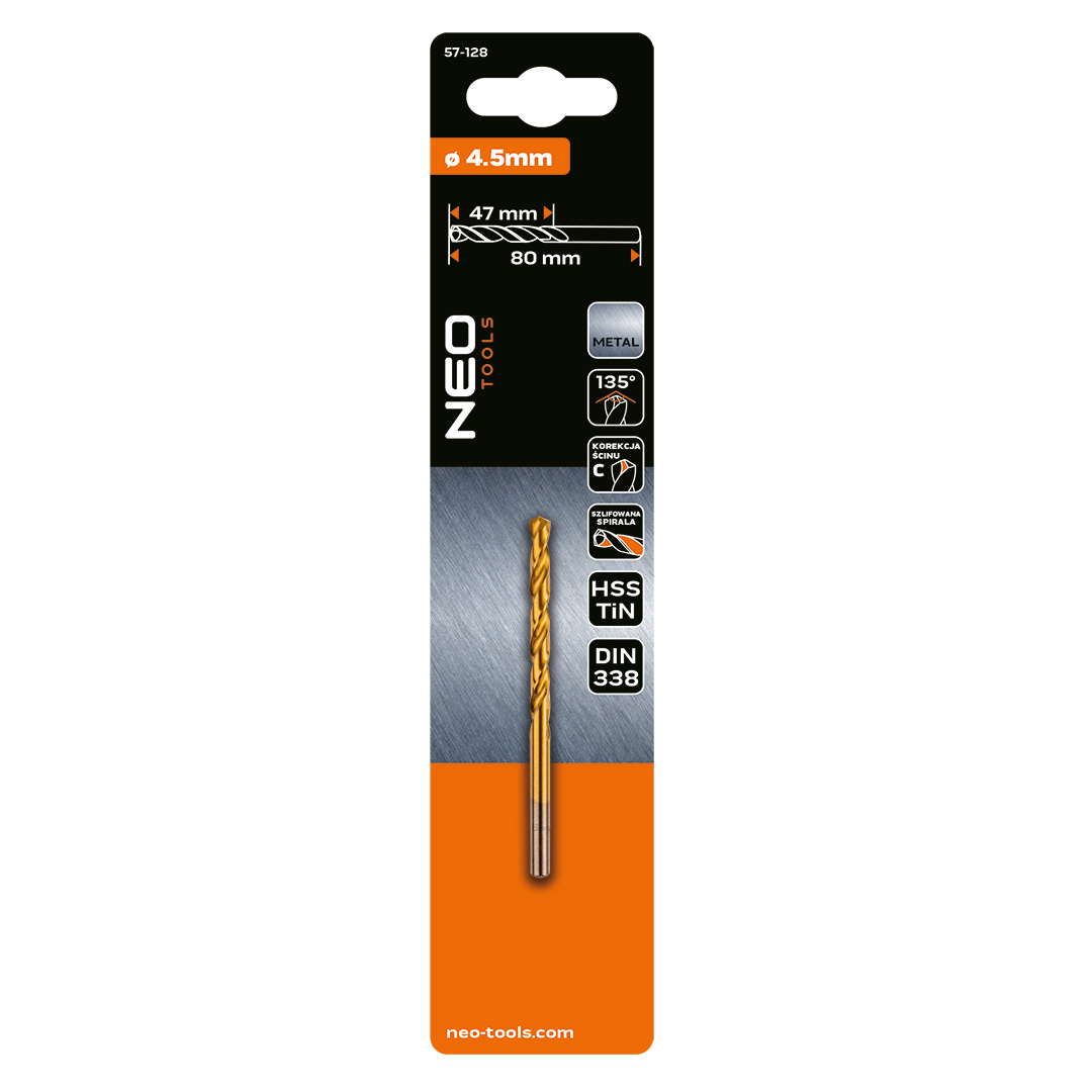 Wiertło do metalu HSS-TiN 4,5 mm 57-128 marki NEO TOOLS to wiertło, które jest głęboko szlifowane zgodnie z DIN 338 i wykonane ze stali 9341; ma kąt wierzchołkowy 135° z korekcją ścinu typu C oraz uchwyt cylindryczny, ułatwiający nawiercanie bez punktowania. Dodatkowa powłoka z azotku tytanu (TiN) obniża opory skrawania i pomaga utrzymać wysoką jakość otworów - szczególnie podczas pracy na stojakach wiertarskich. Długość części roboczej wynosi 47 mm, a całkowita 80 mm, natomiast zalecany zakres prędkości obrotowej dla metalu to 1650-1800 obr./min. Przeznaczenie wiertła od NEO TOOLS obejmuje stal, żeliwo, metale nieżelazne (miedź, aluminium, mosiądz) oraz tworzywa sztuczne.