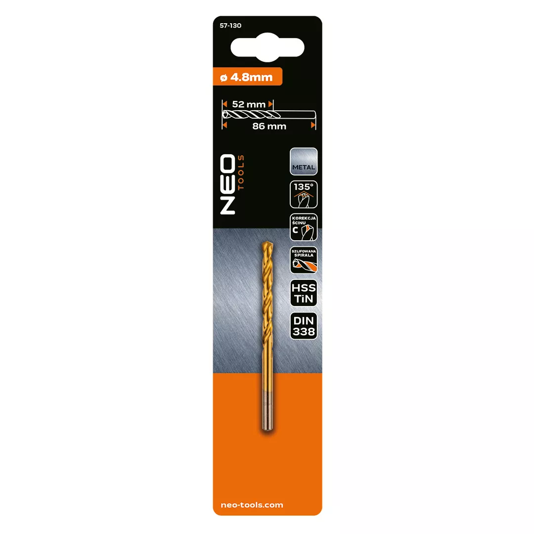 Wiertło do metalu HSS-TiN 4,8 mm 57-130 marki NEO TOOLS to wiertło, które jest głęboko szlifowane zgodnie z DIN 338 i wykonane ze stali 9341; ma kąt wierzchołkowy 135° z korekcją ścinu typu C oraz uchwyt cylindryczny, ułatwiający nawiercanie bez punktowania. Dodatkowa powłoka z azotku tytanu (TiN) obniża opory skrawania i pomaga utrzymać wysoką jakość otworów - szczególnie podczas pracy na stojakach wiertarskich. Długość części roboczej wynosi 52 mm, a całkowita 86 mm, natomiast zalecany zakres prędkości obrotowej dla metalu to 1500-1650 obr./min. Przeznaczenie wiertła od NEO TOOLS obejmuje stal, żeliwo, metale nieżelazne (miedź, aluminium, mosiądz) oraz tworzywa sztuczne.