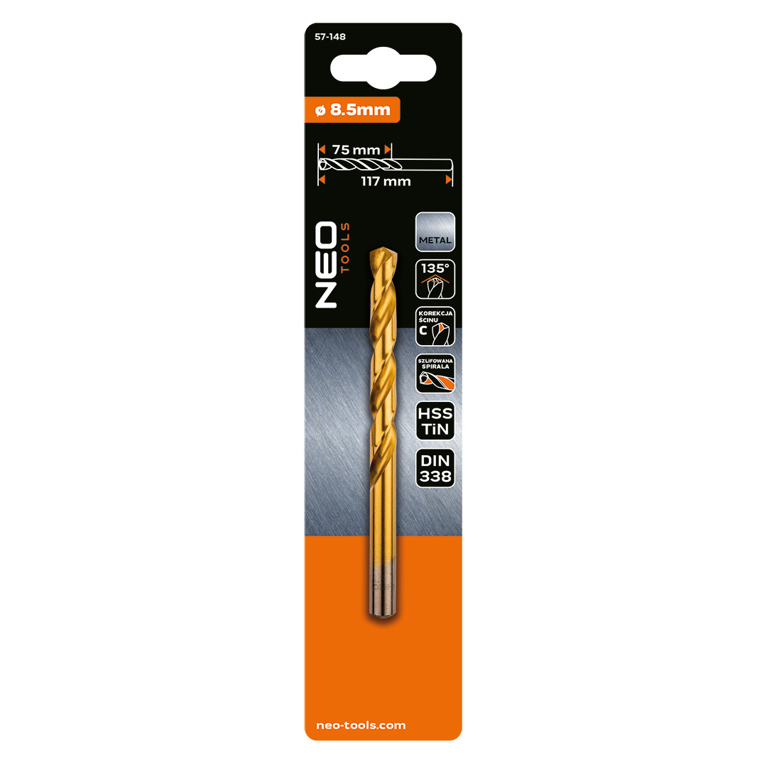 Wiertło do metalu HSS-TiN 8,5 mm 57-148 marki NEO TOOLS to wiertło, które jest głęboko szlifowane zgodnie z DIN 338 i wykonane ze stali 9341; ma kąt wierzchołkowy 135° z korekcją ścinu typu C oraz uchwyt cylindryczny, ułatwiający nawiercanie bez punktowania. Dodatkowa powłoka z azotku tytanu (TiN) obniża opory skrawania i pomaga utrzymać wysoką jakość otworów - szczególnie podczas pracy na stojakach wiertarskich. Długość części roboczej wynosi 75 mm, a całkowita 117 mm, natomiast zalecany zakres prędkości obrotowej dla metalu to 850-950 obr./min. Przeznaczenie wiertła od NEO TOOLS obejmuje stal, żeliwo, metale nieżelazne (miedź, aluminium, mosiądz) oraz tworzywa sztuczne.
