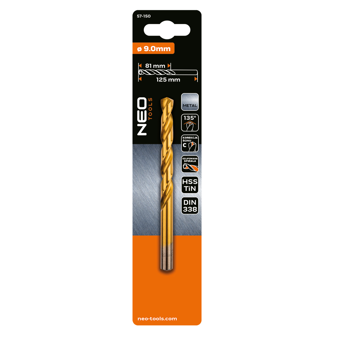 Wiertło do metalu HSS-TiN 9,0 mm 57-150 marki NEO TOOLS to wiertło, które jest głęboko szlifowane zgodnie z DIN 338 i wykonane ze stali 9341; ma kąt wierzchołkowy 135° z korekcją ścinu typu C oraz uchwyt cylindryczny, ułatwiający nawiercanie bez punktowania. Dodatkowa powłoka z azotku tytanu (TiN) obniża opory skrawania i pomaga utrzymać wysoką jakość otworów - szczególnie podczas pracy na stojakach wiertarskich. Długość części roboczej wynosi 81 mm, a całkowita 125 mm, natomiast zalecany zakres prędkości obrotowej dla metalu to 800-900 obr./min. Przeznaczenie wiertła od NEO TOOLS obejmuje stal, żeliwo, metale nieżelazne (miedź, aluminium, mosiądz) oraz tworzywa sztuczne.