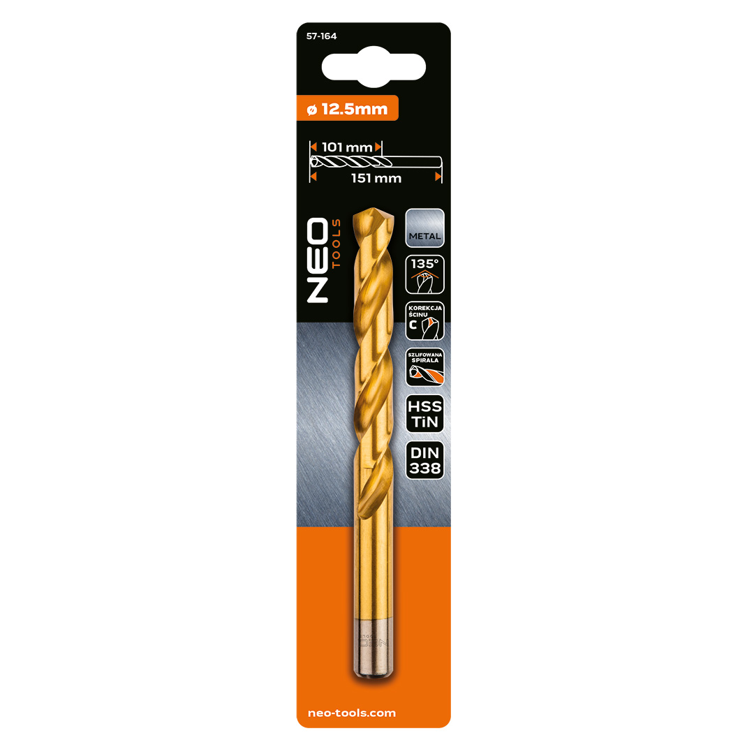 Wiertło do metalu HSS-TiN 12,5 mm 57-164 marki NEO TOOLS to wiertło, które jest głęboko szlifowane zgodnie z DIN 338 i wykonane ze stali 9341; ma kąt wierzchołkowy 135° z korekcją ścinu typu C oraz uchwyt cylindryczny, ułatwiający nawiercanie bez punktowania. Dodatkowa powłoka z azotku tytanu (TiN) obniża opory skrawania i pomaga utrzymać wysoką jakość otworów - szczególnie podczas pracy na stojakach wiertarskich. Długość części roboczej wynosi 101 mm, a całkowita 151 mm, natomiast zalecany zakres prędkości obrotowej dla metalu to 600-650 obr./min. Przeznaczenie wiertła od NEO TOOLS obejmuje stal, żeliwo, metale nieżelazne (miedź, aluminium, mosiądz) oraz tworzywa sztuczne.