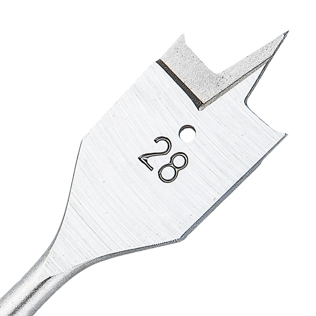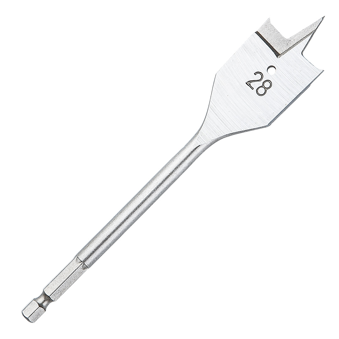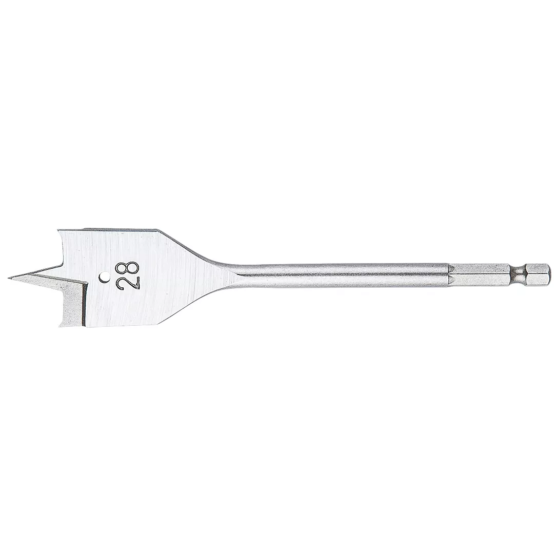 Wiertło do drewna łopatkowe, średnica 28 mm, długość całkowita 152 mm, hartowane ostrze, uchwyt sześciokątny typu "quick change"