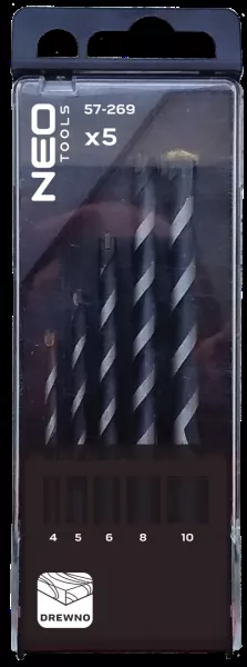 Wiertła do drewna spiralne, 4 - 10 mm, zestaw 5 sztuk 57-269 marki NEO TOOLS o średnicach 4, 5, 6, 8, 10 mm. Przeznaczone do wiercenia w różnych rodzajach drewna, sklejce oraz materiałach drewnopochodnych. Specjalny profil ostrza oraz gwintowany kolec prowadzący zapewniają precyzyjne i wydajne wiercenie. Uchwyt cylindryczny pasuje do większości uchwytów wiertarskich. Te wiertła marki NEO TOOLS sprawdzą się w wielu zadaniach.
