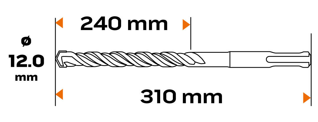 Wiertło do betonu SDS Plus, 12 x 310 mm, S4, quatro 57-444 marki NEO TOOLS to wiertło z końcówką krzyżową, wykonaną z drobnoziarnistego węglika spiekanego. Podwójna spirala S4 zapewnia mu właściwe odprowadzanie urobku i ogranicza ryzyko przegrzewania. Długość robocza wiertła wynosi 250 mm, a jego długość całkowita to 310 mm. Akcesorium posiada chwyt SDS Plus. Jego przeznaczenie to beton, cegła, mur, kamień. Wiertło NEO TOOLS polecane jest do pracy z młotowiertarkami i młotami udarowymi.