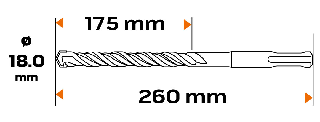Wiertło do betonu SDS Plus, 18 x 260 mm, S4, quatro 57-480 marki NEO TOOLS to wiertło z końcówką krzyżową, wykonaną z drobnoziarnistego węglika spiekanego. Podwójna spirala S4 zapewnia mu właściwe odprowadzanie urobku i ogranicza ryzyko przegrzewania. Długość robocza wiertła wynosi 200 mm, a jego długość całkowita to 260 mm. Akcesorium posiada chwyt SDS Plus. Jego przeznaczenie to beton, cegła, mur, kamień. Wiertło NEO TOOLS polecane jest do pracy z młotowiertarkami i młotami udarowymi.