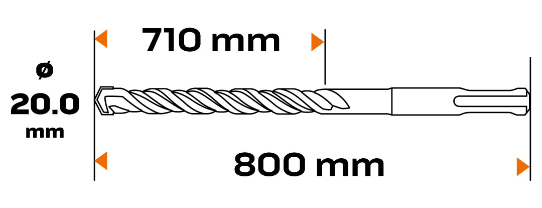 Wiertło do betonu SDS Plus, 20 x 800 mm, S4, quatro 57-490 marki NEO TOOLS to wiertło z końcówką krzyżową, wykonaną z drobnoziarnistego węglika spiekanego. Podwójna spirala S4 zapewnia mu właściwe odprowadzanie urobku i ogranicza ryzyko przegrzewania. Długość robocza wiertła wynosi 715 mm, a jego długość całkowita to 800 mm. Akcesorium posiada chwyt SDS Plus. Jego przeznaczenie to beton, cegła, mur, kamień. Wiertło NEO TOOLS polecane jest do pracy z młotowiertarkami i młotami udarowymi.