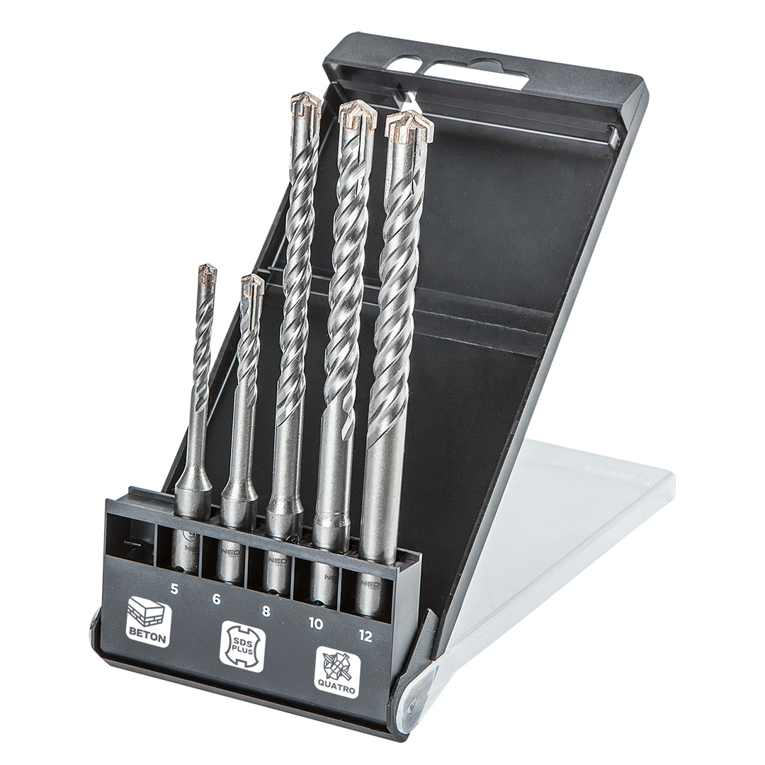 Zestaw wierteł do betonu SDS Plus, quatro, zestaw 5 sztuk – 5,6 x 100 mm + 8,10, 12 x 160 mm 57-572 marki NEO TOOLS to wiertła z końcówką krzyżową, wykonaną z drobnoziarnistego węglika spiekanego. Podwójna spirala S4 zapewnia im właściwe odprowadzanie urobku i ogranicza ryzyko przegrzewania. Długość robocza wierteł wynosi 5:50 mm, 6:50 mm, 8:100 mm, 10:100 mm, 12:100 mm, a ich długości całkowite to 5:110 mm, 6:110 mm, 8:160 mm, 10:160 mm, 12:160 mm. Akcesoria posiadają uchwyt SDS Plus. Ich przeznaczeniem jest beton, cegła, mur, kamień. Zestaw wierteł NEO TOOLS polecany do pracy z młotowiertarkami i młotami udarowymi.