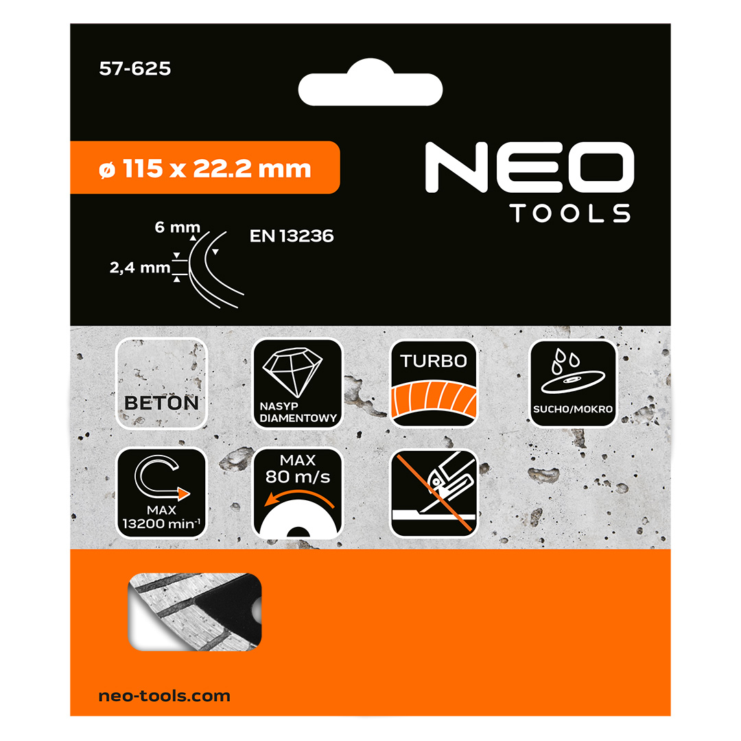 Tarcza diamentowa do cięgia turbo, średnica 115 mm, średnica otworu montażowego 22.2 mm, wyokość segmentu 6 mm, grubość segmentu 2.4 mm, maksymalna prędkośc obrotowa 13 200 obr/min., 80 m/s, norma EN 13236, do pracy na sucho i mokro, do betonu