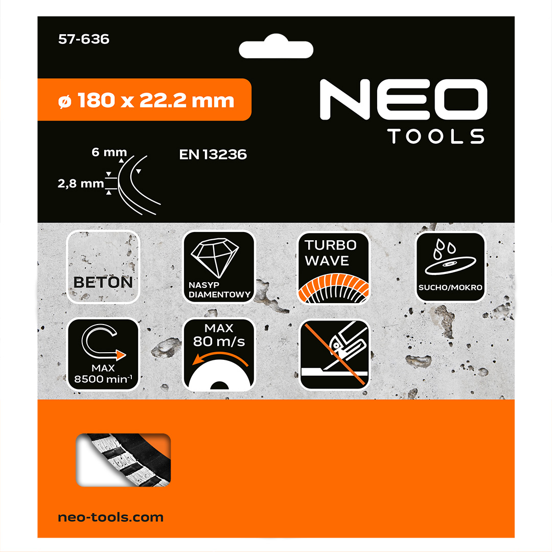 Tarcza diamentowa do cięgia turbo wave, średnica 180 mm, średnica otworu montażowego 22.2 mm, wyokość segmentu 6 mm, grubość segmentu 2.8 mm, maksymalna prędkośc obrotowa 8 500 obr/min., 80 m/s, norma EN 13236, do pracy na sucho i mokro, do betonu