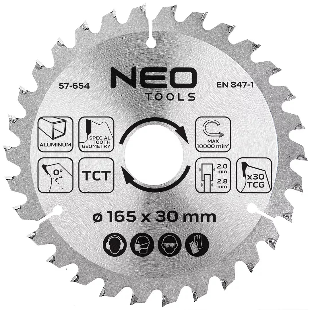 Tarcza do pilarki, widiowa, 165 x 30 mm, 30 zębów, do aluminium 57-654 marki NEO TOOLS wyposażona została w 30 zębów o wymiarach 2,8 mm x 2 mm, wykonanych z węglika spiekanego TCT. Ząb TCG, o specjalnej geometrii i szerokiej części grzebieniowej, gwarantuje zwiększoną wytrzymałość na obciążenia. Tarcza marki NEO TOOLS ze stali manganowej MN65 osiąga maksymalną prędkość obrotową do 10 000 obr./min. W zestawie znajdują się trzy pierścienie, umożliwiające redukcje do wymiarów: 30 x 25,4 mm, 30 x 20 mm i 30 x 16 mm. Tarcza NEO TOOLS przeznaczona jest do cięcia profili aluminiowych oraz innych metali kolorowych. Narzędzie zapewnia czystą i precyzyjną pracę.