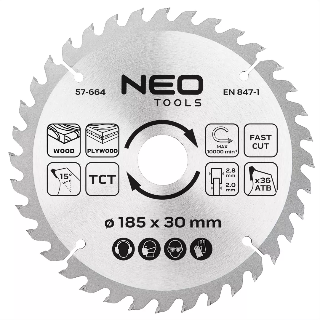 Tarcza do pilarki, widiowa, 185 x 30 mm, 36 zębów 57-664 marki NEO TOOLS wyposażona została w 36 zębów o wymiarach 2,8 mm x 2 mm, wykonanych z węglika spiekanego. Ząb ATB, o specjalnej geometrii naprzemianległej, gwarantuje zwiększoną dokładność cięcia. Tarcza marki NEO TOOLS ze stali manganowej MN65 osiąga maksymalną prędkość obrotową do 10 000 obr./min. W zestawie znajdują się trzy pierścienie, umożliwiające redukcje do wymiarów: 30 x 25,4 mm, 30 x 20 mm i 30 x 16 mm. Tarcza NEO TOOLS przeznaczona jest do cięcia drewna, materiałów drewnopochodnych, sklejek, laminatów, MDF. Narzędzie zapewnia czystą i precyzyjną pracę.