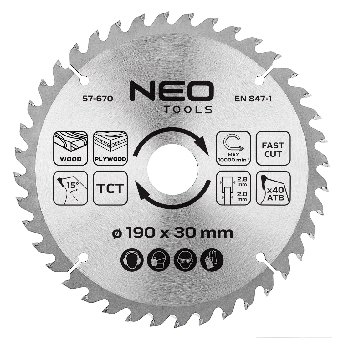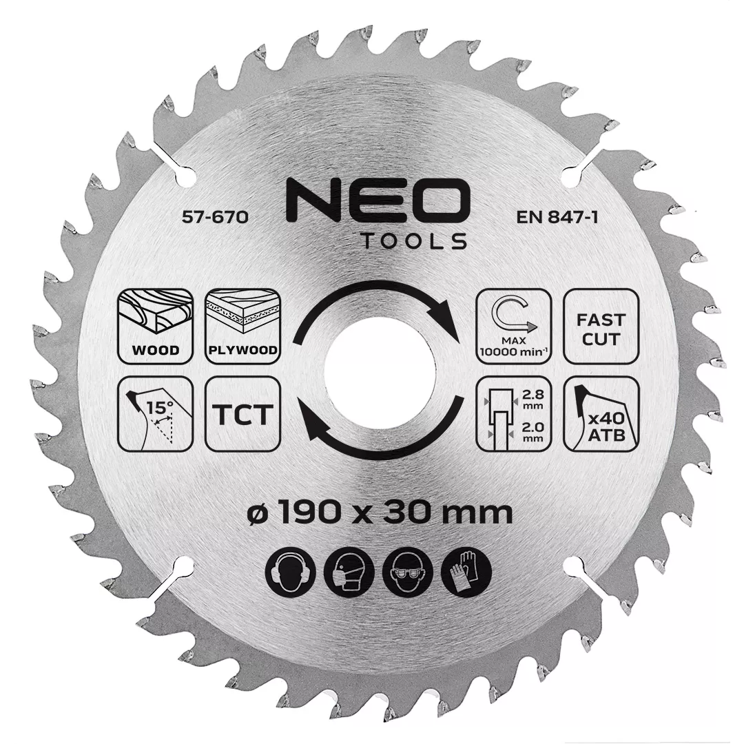 Tarcza do pilarki, widiowa, 190 x 30 mm, 40 zębów 57-670 marki NEO TOOLS wyposażona została w 40 zębów o wymiarach 2,8 mm x 2,0 mm, wykonanych z węglika spiekanego. Ząb ATB, o specjalnej geometrii naprzemianległej, gwarantuje zwiększoną dokładność cięcia. Tarcza marki NEO TOOLS ze stali manganowej MN65 osiąga maksymalną prędkość obrotową do 10 000 obr./min. W zestawie znajdują się trzy pierścienie, umożliwiające redukcje do wymiarów: 30 x 25,4 mm, 30 x 20 mm i 30 x 16 mm. Tarcza NEO TOOLS przeznaczona jest do cięcia drewna, materiałów drewnopochodnych, sklejek, laminatów, MDF. Narzędzie zapewnia szybką i precyzyjną pracę.