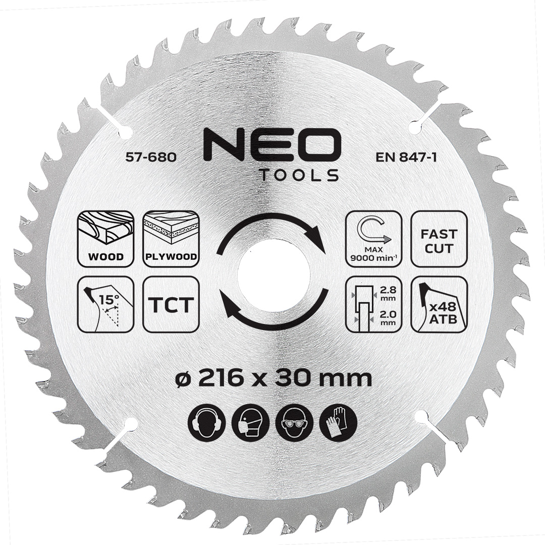 Tarcza do pilarki, widiowa, 216 x 30 mm, 48 zębów 57-680 marki NEO TOOLS wyposażona została w 48 zębów o wymiarach 2,8 mm x 2,0 mm, wykonanych z węglika spiekanego. Ząb ATB, o specjalnej geometrii naprzemianległej, gwarantuje zwiększoną dokładność cięcia. Tarcza marki NEO TOOLS ze stali manganowej MN65 osiąga maksymalną prędkość obrotową do 9 000 obr./min. W zestawie znajdują się trzy pierścienie, umożliwiające redukcje do wymiarów: 30 x 25,4 mm, 30 x 20 mm i 30 x 16 mm. Tarcza NEO TOOLS przeznaczona jest do cięcia drewna, materiałów drewnopochodnych, sklejek, laminatów, MDF. Narzędzie zapewnia szybką i precyzyjną pracę.
