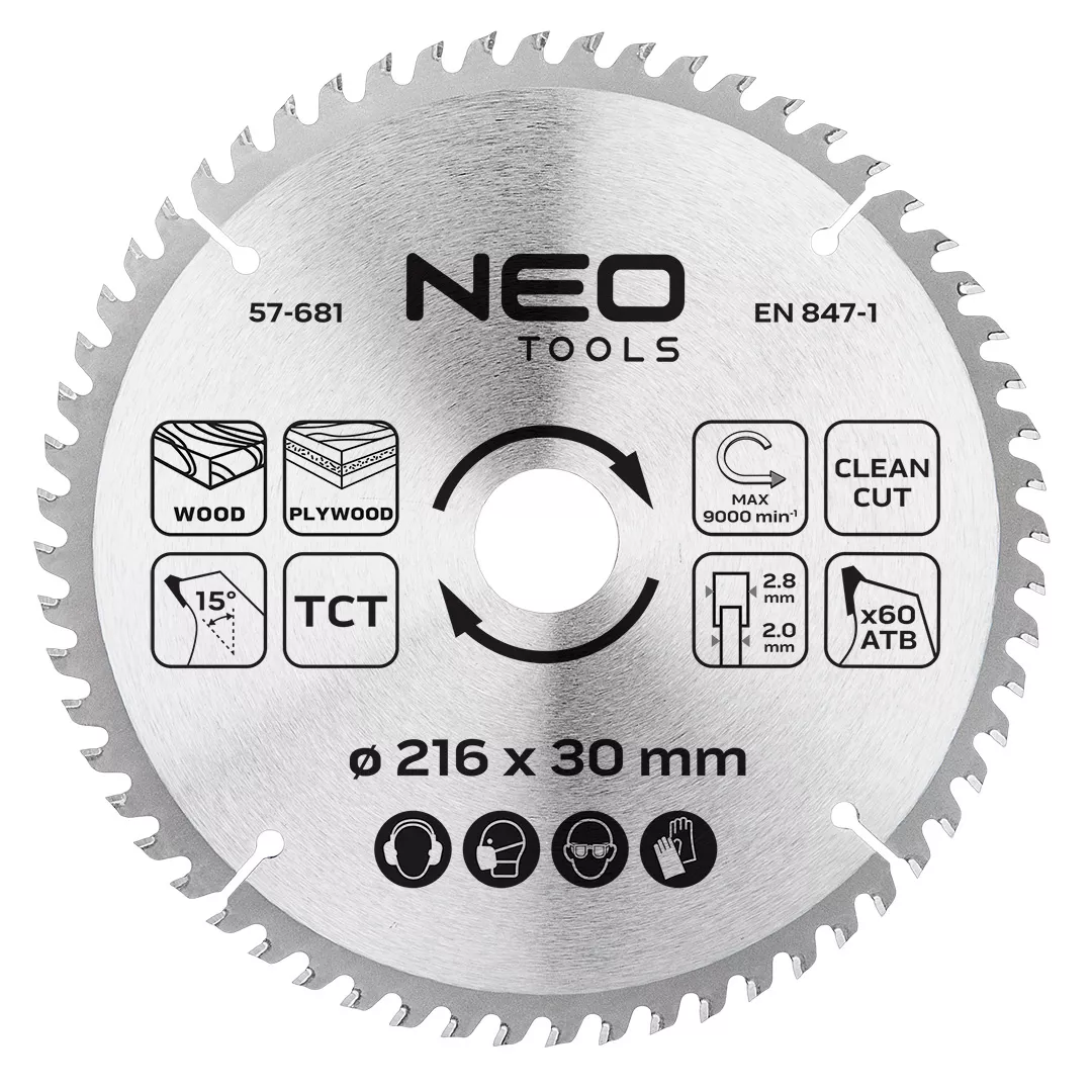 Tarcza do pilarki, widiowa, 216 x 30 mm, 60 zębów 57-681 marki NEO TOOLS wyposażona została w 60 zębów o wymiarach 2,8 mm x 2,0 mm, wykonanych z węglika spiekanego. Ząb ATB, o specjalnej geometrii naprzemianległej, gwarantuje zwiększoną dokładność cięcia. Tarcza marki NEO TOOLS ze stali manganowej MN65 osiąga maksymalną prędkość obrotową do 9 000 obr./min. W zestawie znajdują się trzy pierścienie, umożliwiające redukcje do wymiarów: 30 x 25,4 mm, 30 x 20 mm i 30 x 16 mm. Tarcza NEO TOOLS przeznaczona jest do cięcia drewna, materiałów drewnopochodnych, sklejek, laminatów, MDF. Narzędzie zapewnia czystą i precyzyjną pracę.
