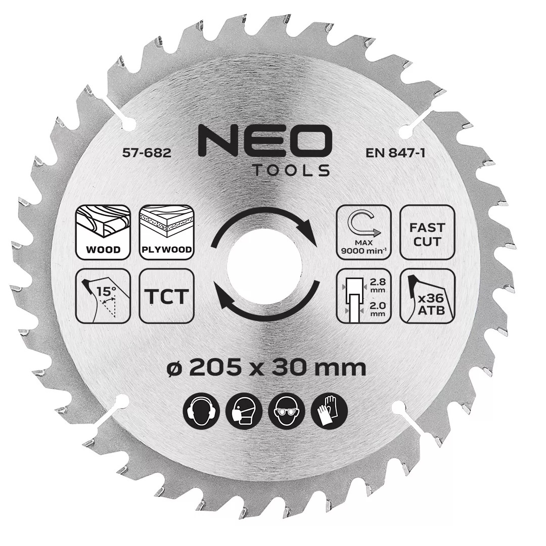 Tarcza do pilarki, widiowa, 205 x 30 mm, 36 zębów 57-682 marki NEO TOOLS wyposażona została w 36 zębów o wymiarach 2,8 mm x 2,0 mm, wykonanych z węglika spiekanego. Ząb ATB, o specjalnej geometrii naprzemianległej, gwarantuje zwiększoną dokładność cięcia. Tarcza marki NEO TOOLS ze stali manganowej MN65 osiąga maksymalną prędkość obrotową do 9 000 obr./min. W zestawie znajdują się trzy pierścienie, umożliwiające redukcje do wymiarów: 30 x 25,4 mm, 30 x 20 mm i 30 x 16 mm. Tarcza NEO TOOLS przeznaczona jest do cięcia drewna, materiałów drewnopochodnych, sklejek, laminatów, MDF. Narzędzie zapewnia szybką i precyzyjną pracę.