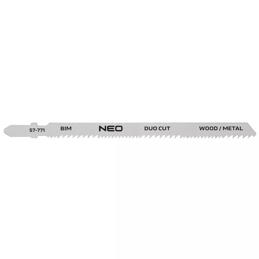Brzeszczot do wyrzynarki, 10-14 TPI, BIM, uchwyt typu T, 2 sztuki w komplecie, długość całkowita: 130 mm, długość robocza: 106 mm, grubość: 1.0 mm, rozstaw zębów: 1,8-2,6 mm, zastosowanie: drewno konstrukcyjne z gwoździami (<65 mm), materiały drewniane, tworzywo sztuczne, rury/profile, w tym aluminiowe (średnica <65 mm)