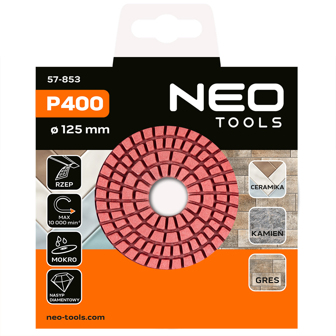Diamentowy dysk polerski na rzep, o średnicy 125 mm, P400, do pracy na mokro, nasyp diamentowy, max. prędkość obrotowa 10 000 obr/min, zastosowanie: do ceramiki, gresu, kaminia