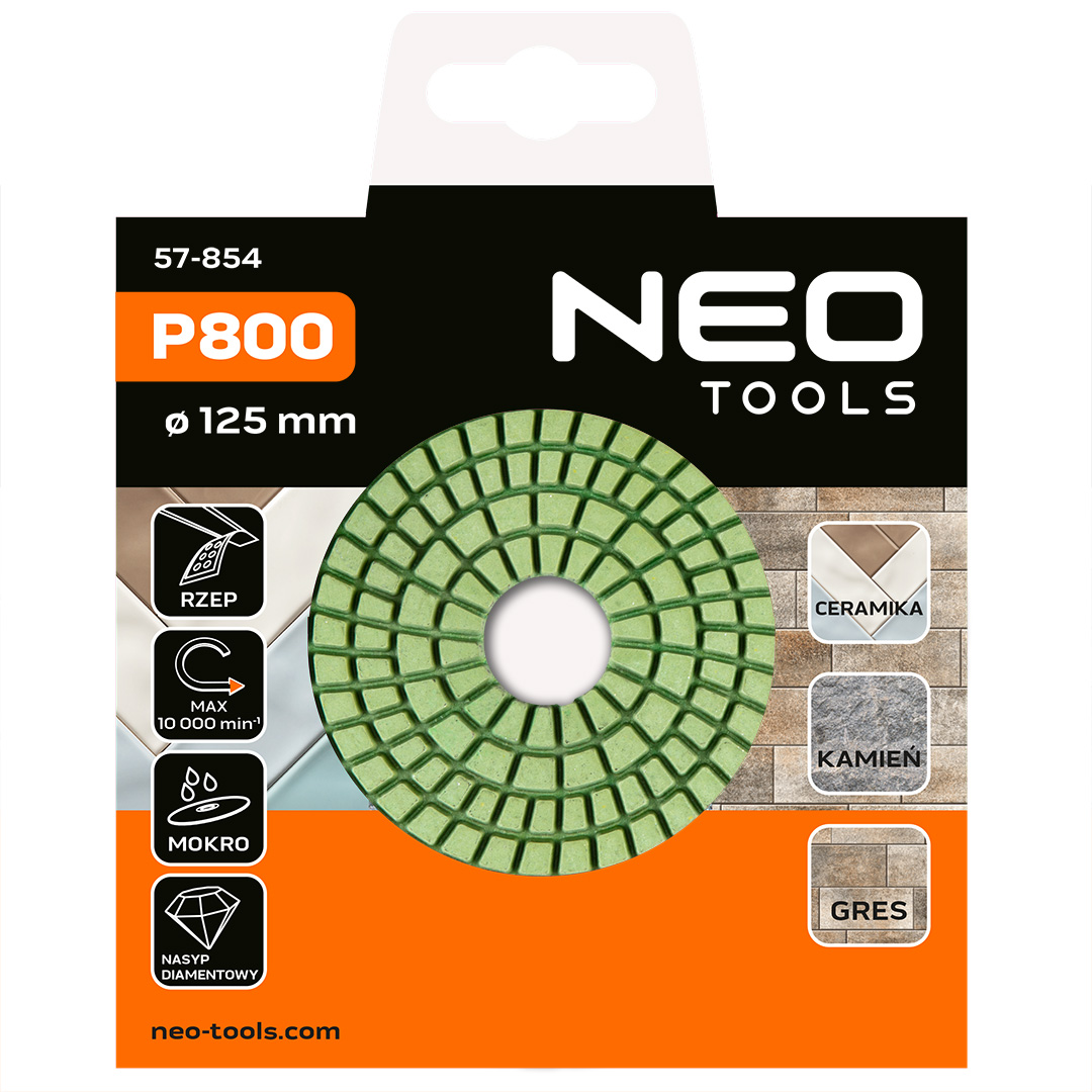 Diamentowy dysk polerski na rzep, o średnicy 125 mm, P800, do pracy na mokro, nasyp diamentowy, max. prędkość obrotowa 10 000 obr/min, zastosowanie: do ceramiki, gresu, kaminia
