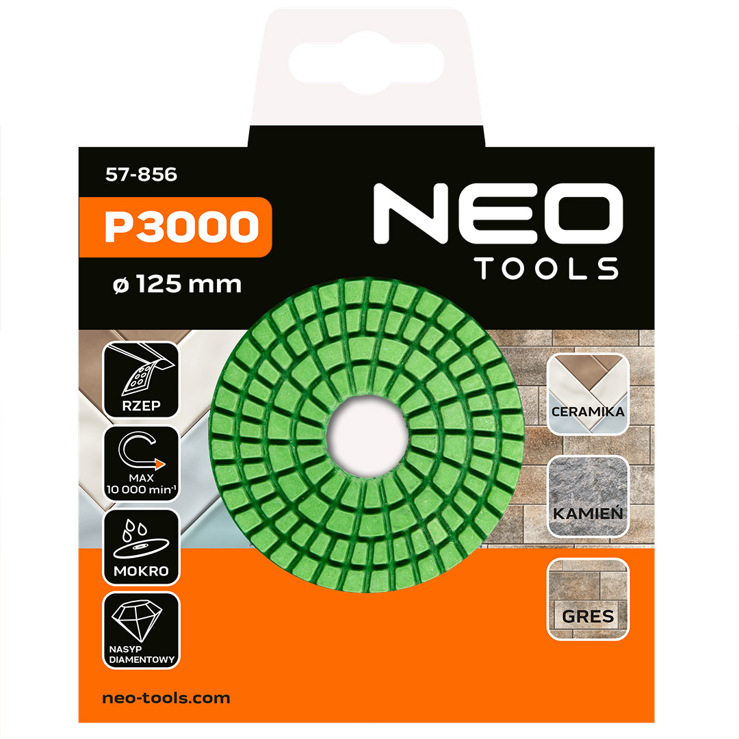 Diamentowy dysk polerski na rzep, o średnicy 125 mm, P3000, do pracy na mokro, nasyp diamentowy, max. prędkość obrotowa 10 000 obr/min, zastosowanie: do ceramiki, gresu, kaminia