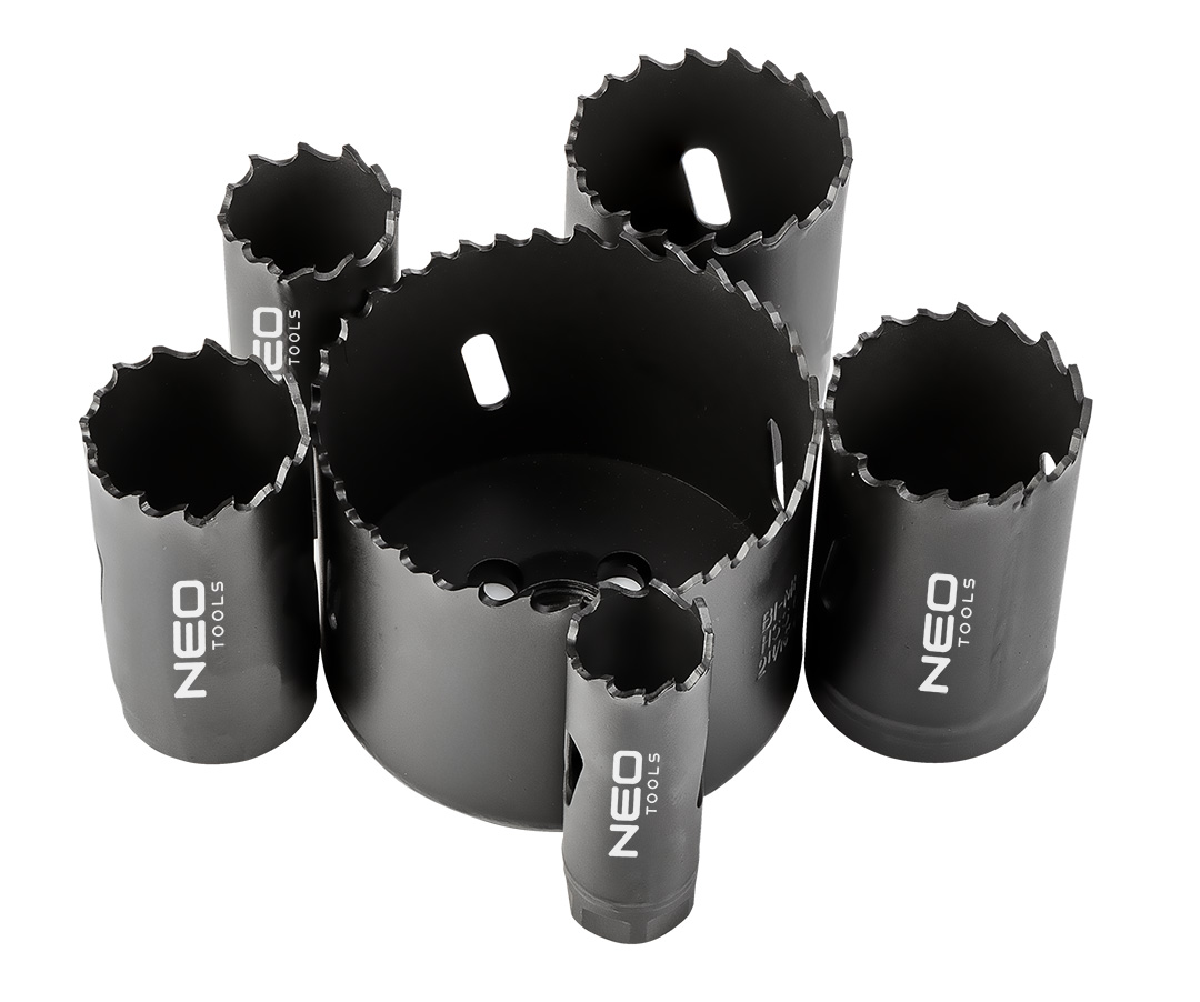 Otwornice bi-metalowe Co 8%, średnice 19, 25, 30, 35, 40, 68 mm, wysokość 50 mm, maksymalna głębokość wiercenia 44 mm, 1x adapter 1/4” (6,35 mm) z wiertłem pilotującym; 1x adapter 7/16” (11 mm) z wiertłem pilotującym; klucz imbusowy, zastosowanie: metal, INOX, aluminium, tworzywo sztuczne, miedź, drewno