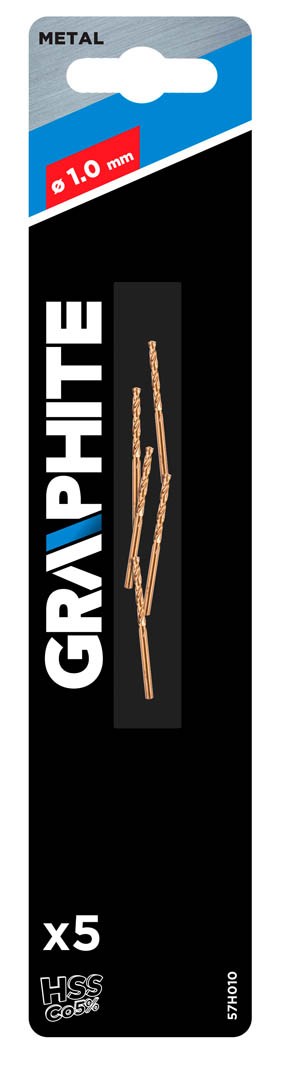 Wiertła do metalu GRAPHITE (nr ref. 57H010) o średnicy 1.0 mm są wykonane z wysokogatunkowego stopu stali szybkotnącej M35 z 5% dodatkiem kobaltu. Kąt wierzchołkowy 135° i korekta ścinu umożliwiają łatwe nawiercanie otworów bez punktowania. Dzięki odporności stopu na wysoką temperaturę, idealnie nadają się do wiercenia otworów w materiałach trudnoobrabialnych, takich jak stal nierdzewna, kwasoodporna, żaroodporna itp.