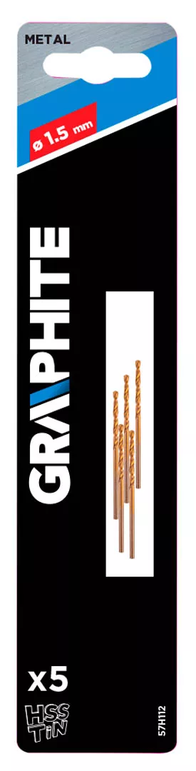 Wiertła do metalu GRAPHITE (nr ref. 57H112) o średnicy 1.5 mm, wykonane ze stopu stali szybkotnącej 9341. Dodatkowe pokrycie warstwą azotku tytanu pozwala na obniżenie oporów skrawania i zachowanie wysokiej jakości wierconych otworów, szczególnie w trakcie wiercenia otworów przy pomocy automatów wiertarskich. Kąt wierzchołkowy 135° i korekta ścinu umożliwiają łatwe nawiercanie otworów bez punktowania. Idealnie nadają się do wiercenia w stali, żeliwie, elementach wykonanych z metali kolorowych (miedź, aluminium, mosiądz).