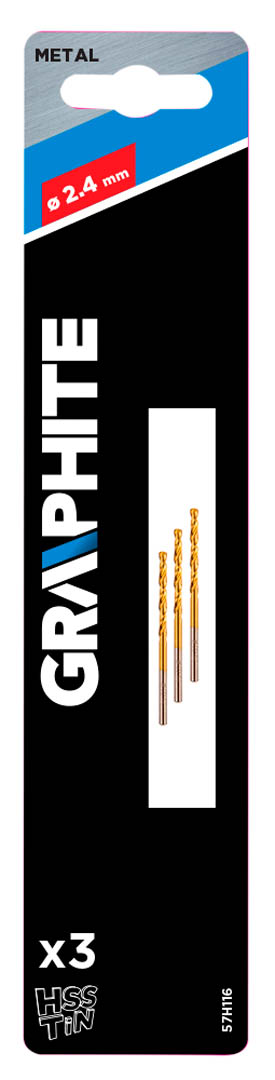 Wiertła do metalu GRAPHITE (nr ref. 57H116) o średnicy 2.4 mm, wykonane ze stopu stali szybkotnącej 9341. Dodatkowe pokrycie warstwą azotku tytanu pozwala na obniżenie oporów skrawania i zachowanie wysokiej jakości wierconych otworów, szczególnie w trakcie wiercenia otworów przy pomocy automatów wiertarskich. Kąt wierzchołkowy 135° i korekta ścinu umożliwiają łatwe nawiercanie otworów bez punktowania. Idealnie nadają się do wiercenia w stali, żeliwie, elementach wykonanych z metali kolorowych (miedź, aluminium, mosiądz).