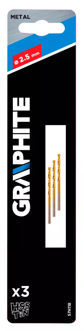 Wiertła do metalu GRAPHITE (nr ref. 57H118) o średnicy 2.5 mm, wykonane ze stopu stali szybkotnącej 9341. Dodatkowe pokrycie warstwą azotku tytanu pozwala na obniżenie oporów skrawania i zachowanie wysokiej jakości wierconych otworów, szczególnie w trakcie wiercenia otworów przy pomocy automatów wiertarskich. Kąt wierzchołkowy 135° i korekta ścinu umożliwiają łatwe nawiercanie otworów bez punktowania. Idealnie nadają się do wiercenia w stali, żeliwie, elementach wykonanych z metali kolorowych (miedź, aluminium, mosiądz).