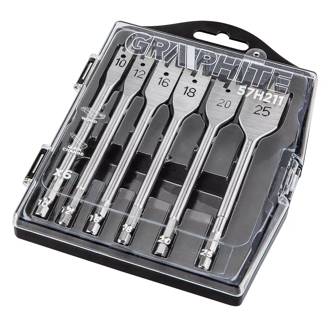 Zestaw wierteł łopatkowych do drewna GRAPHITE (nr ref. 57H211) o średnicach od 6.0 mm do 25 mm, dzięki specjalnemu profilowi ostrza pozwalają dwukrotnie zwiększyć prędkość wiercenia i uniknąć efektu wyrywania materiału. Sześciokątny uchwyt typu "Quick Change" pozwala stosować wiertło w uchwytach magnetycznych wkrętarek akumulatorowych.
