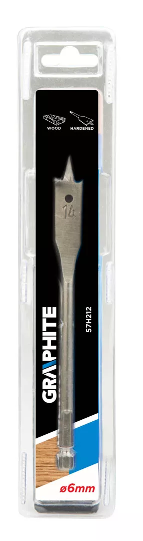 Wiertło łopatkowe do drewna GRAPHITE (nr ref. 57H212) o średnicy 6.0 mm dzięki specjalnemu profilowi ostrza pozwala dwukrotnie zwiększyć prędkość wiercenia i uniknąć efektu wyrywania materiału. Sześciokątny uchwyt typu "Quick Change" pozwala stosować wiertło w uchwytach magnetycznych wkrętarek akumulatorowych.