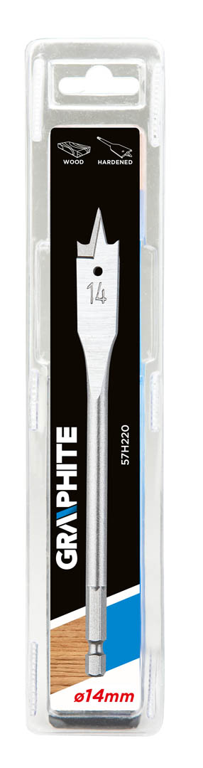 Wiertło łopatkowe do drewna GRAPHITE (nr ref. 57H220) o średnicy 14.0 mm dzięki specjalnemu profilowi ostrza pozwala dwukrotnie zwiększyć prędkość wiercenia i uniknąć efektu wyrywania materiału. Sześciokątny uchwyt typu "Quick Change" pozwala stosować wiertło w uchwytach magnetycznych wkrętarek akumulatorowych.