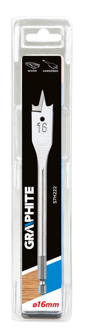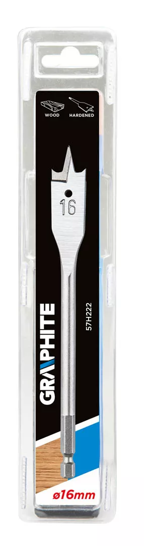 Wiertło łopatkowe do drewna GRAPHITE (nr ref. 57H222) o średnicy 16.0 mm dzięki specjalnemu profilowi ostrza pozwala dwukrotnie zwiększyć prędkość wiercenia i uniknąć efektu wyrywania materiału. Sześciokątny uchwyt typu "Quick Change" pozwala stosować wiertło w uchwytach magnetycznych wkrętarek akumulatorowych.