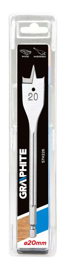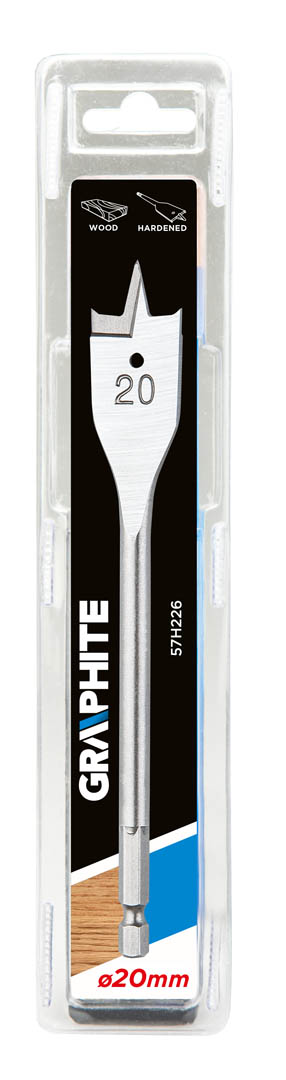 Wiertło łopatkowe do drewna GRAPHITE (nr ref. 57H226) o średnicy 20.0 mm dzięki specjalnemu profilowi ostrza pozwala dwukrotnie zwiększyć prędkość wiercenia i uniknąć efektu wyrywania materiału. Sześciokątny uchwyt typu "Quick Change" pozwala stosować wiertło w uchwytach magnetycznych wkrętarek akumulatorowych.