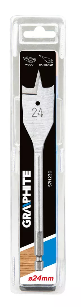 Wiertło łopatkowe do drewna GRAPHITE (nr ref. 57H230) o średnicy 24.0 mm dzięki specjalnemu profilowi ostrza pozwala dwukrotnie zwiększyć prędkość wiercenia i uniknąć efektu wyrywania materiału. Sześciokątny uchwyt typu "Quick Change" pozwala stosować wiertło w uchwytach magnetycznych wkrętarek akumulatorowych.