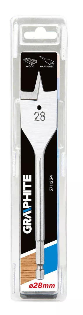 Wiertło łopatkowe do drewna GRAPHITE (nr ref. 57H234) o średnicy 28.0 mm dzięki specjalnemu profilowi ostrza pozwala dwukrotnie zwiększyć prędkość wiercenia i uniknąć efektu wyrywania materiału. Sześciokątny uchwyt typu "Quick Change" pozwala stosować wiertło w uchwytach magnetycznych wkrętarek akumulatorowych.