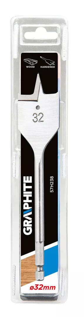 Wiertło łopatkowe do drewna GRAPHITE (nr ref. 57H238) o średnicy 32.0 mm dzięki specjalnemu profilowi ostrza pozwala dwukrotnie zwiększyć prędkość wiercenia i uniknąć efektu wyrywania materiału. Sześciokątny uchwyt typu "Quick Change" pozwala stosować wiertło w uchwytach magnetycznych wkrętarek akumulatorowych.