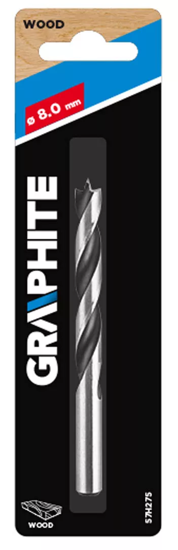 Wiertło spiralne do drewna GRAPHITE (nr ref. 57H275) o średnicy 8.0 mm dzięki specjalnemu profilowi ostrza z kolcem prowadzącym pozwala precyzyjnie i wydajnie wiercić otwory w drewnie.