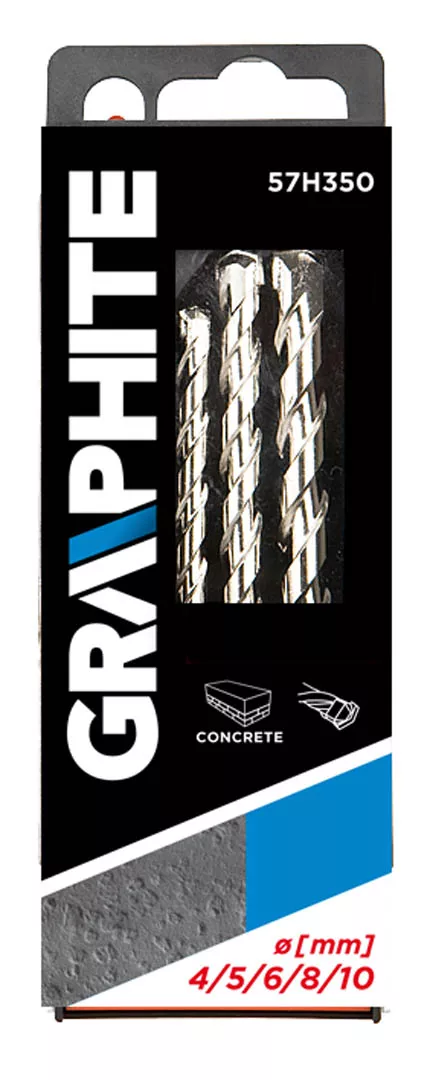 Zestaw wierteł do betonu GRAPHITE (nr ref. 57H350) o średnicach od 4.0 do 10.0 mm, posiadających końcówki widiowe o kształcie motylkowym. Pozwala to na wiercenie otworów w betonie i materiałach ceramicznych bez obawy o uślizgiwanie się wiertła na boki w pierwszej fazie wiercenia.