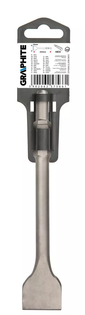 Dłuto GRAPHITE (nr ref. 57H566) z uchwytem HEX o szerokości 35 mm dzięki wykonaniu z hartowanej stali węglowej idealnie nadaje się do mechanicznego wykuwania otworów i bruzd w elementach betonowych, kamiennych, ceglanych.