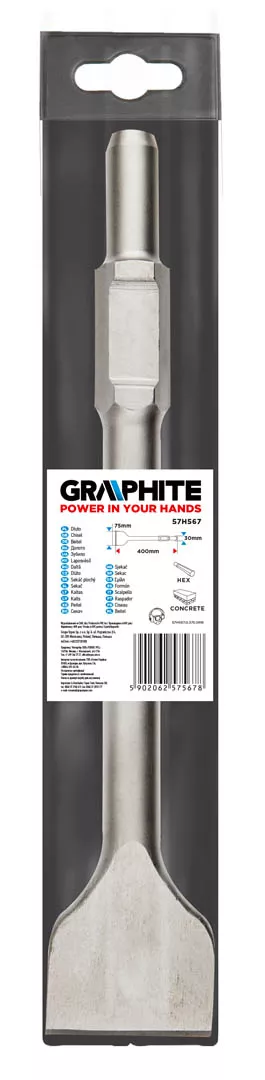 Dłuto GRAPHITE (nr ref. 57H567) z uchwytem HEX o szerokości 75 mm dzięki wykonaniu z hartowanej stali węglowej idealnie nadaje się do mechanicznego wykuwania otworów i bruzd w elementach betonowych, kamiennych, ceglanych.