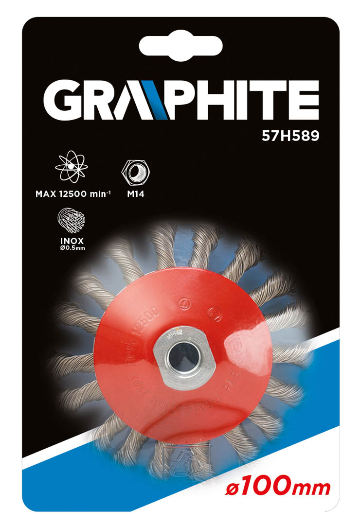 Szczotka druciana GRAPHITE (nr ref. 57H589) o średnicy 100 mm, wykonana z drutu ze stali nierdzewnej o grubości 0.5 mm. Wzmocniona konstrukcja korpusu pozwala na wydajne czyszczenie konstrukcji stalowych ze stali nierdzewnej i stali kwasoodpornej. Mocowanie przystosowane do współpracy ze szlifierkami kątowymi.