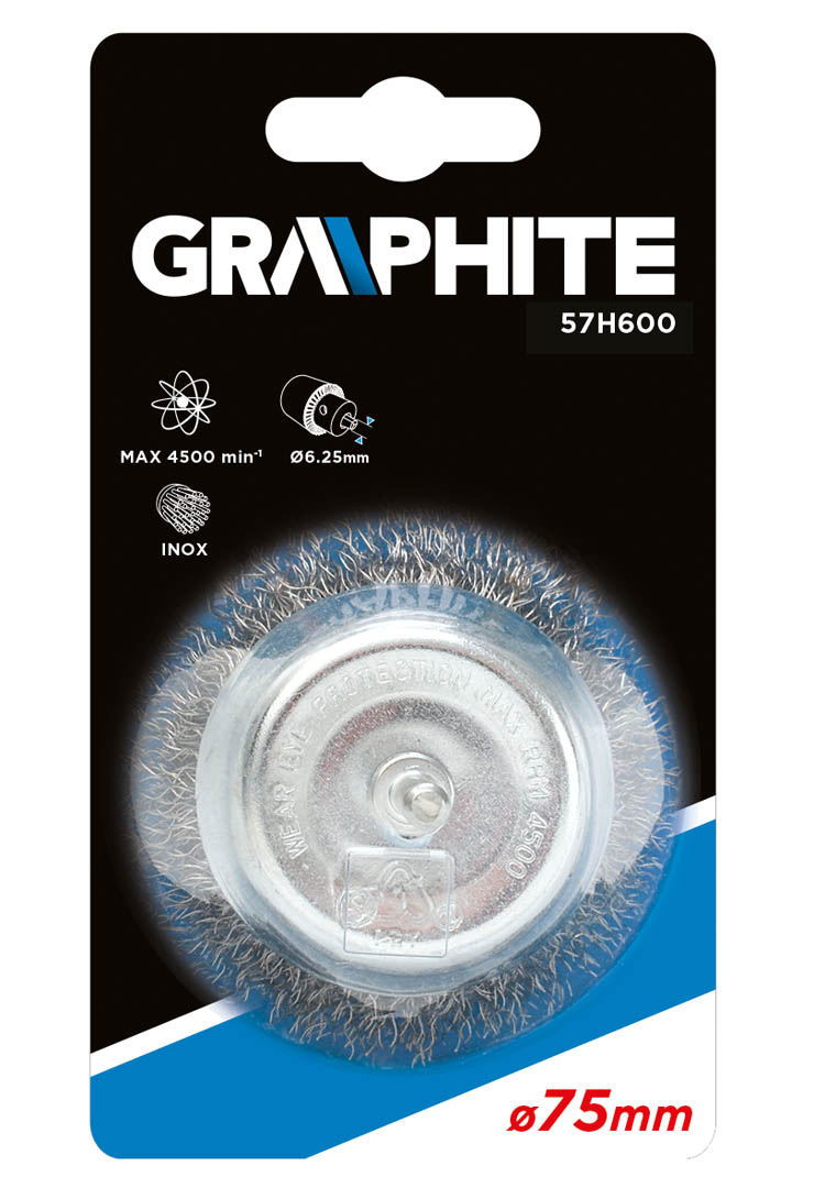 Szczotka druciana GRAPHITE (nr ref. 57H600) o średnicy 75 mm, wykonana z drutu ze stali nierdzewnej o grubości 0.5 mm. Wzmocniona konstrukcja korpusu pozwala na wydajne czyszczenie konstrukcji stalowych ze stali nierdzewnej i stali kwasoodpornej. Mocowanie przystosowane do współpracy z wiertarkami.