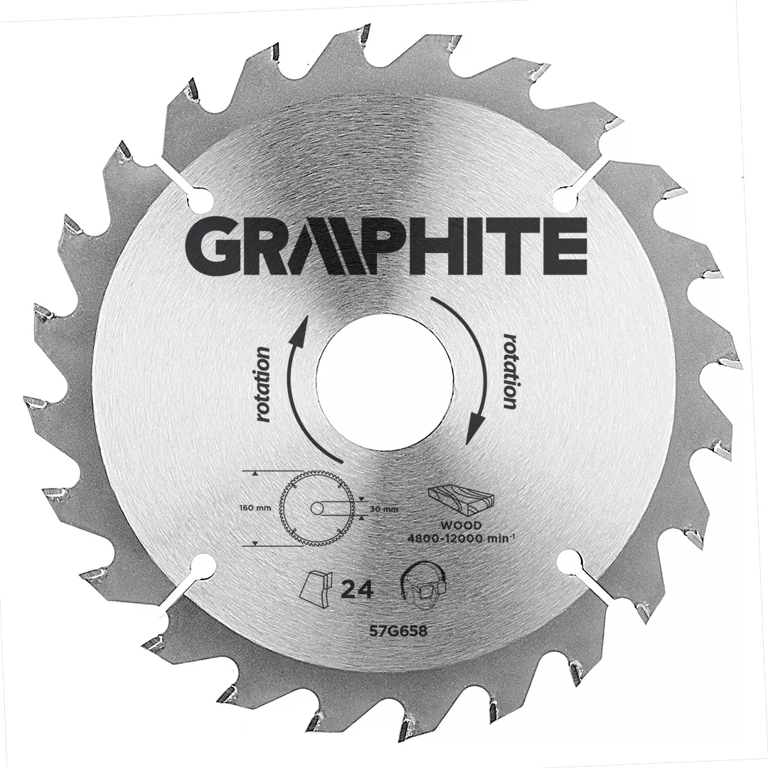 Tarcza do pilarki widiowa GRAPHITE (nr ref. 57H658) o średnicy zewnętrznej 160 mm, wykonana ze stopu stali manganowej MN65 o dużej odporności na temperaturę i odkształcenia. Zęby z nakładkami z węglika spiekanego YG6A pozwalają na średnio dokładne cięcie drewna i materiałów drewnopochodnych, takich jak sklejka, płyta wiórowa, MDF. Zawarte w opakowaniu pierścienie redukcyjne umożliwiają zastosowanie tarczy do większości modeli pilarek.
