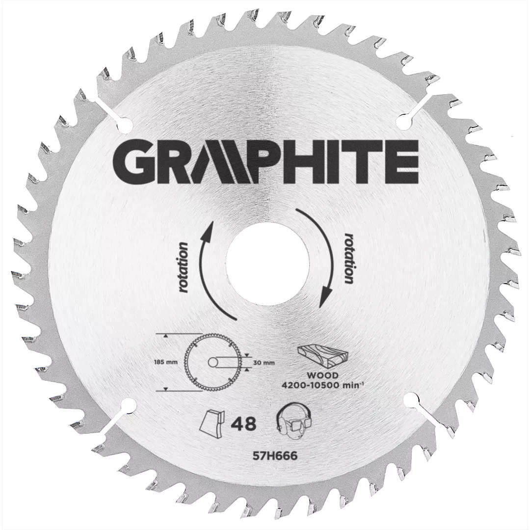 Tarcza do pilarki widiowa GRAPHITE (nr ref. 57H666) o średnicy zewnętrznej 185 mm, wykonana ze stopu stali manganowej MN65 o dużej odporności na temperaturę i odkształcenia. Zęby z nakładkami z węglika spiekanego YG6A pozwalają na precyzyjne cięcie drewna i materiałów drewnopochodnych, takich jak sklejka, płyta wiórowa, MDF. Zawarte w opakowaniu pierścienie redukcyjne umożliwiają zastosowanie tarczy do większości modeli pilarek.