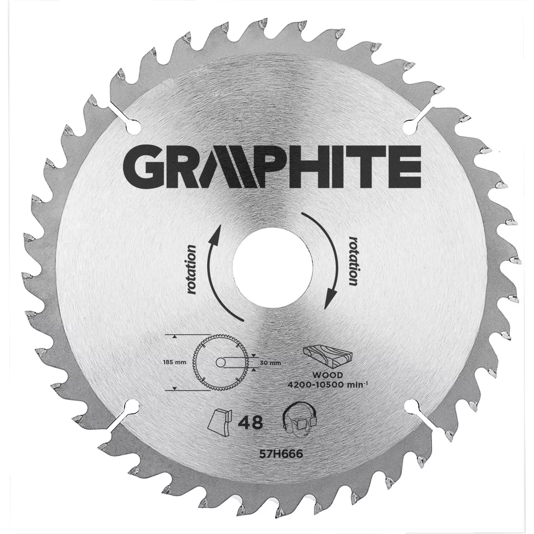 Tarcza do pilarki widiowa GRAPHITE (nr ref. 57H670) o średnicy zewnętrznej 190 mm, wykonana ze stopu stali manganowej MN65 o dużej odporności na temperaturę i odkształcenia. Zęby z nakładkami z węglika spiekanego YG6A pozwalają na średnio dokładne cięcie drewna i materiałów drewnopochodnych, takich jak sklejka, płyta wiórowa, MDF. Zawarte w opakowaniu pierścienie redukcyjne umożliwiają zastosowanie tarczy do większości modeli pilarek.