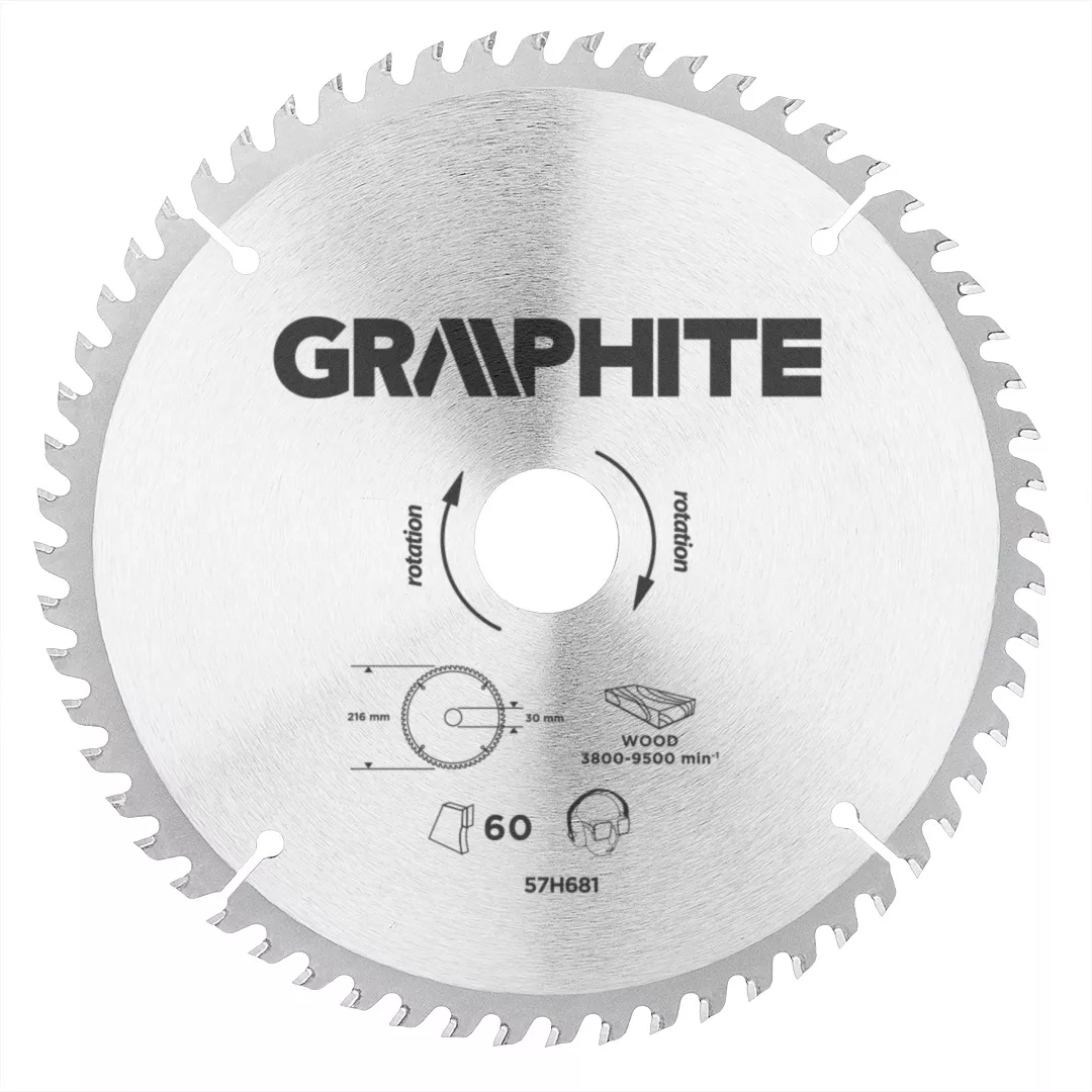 Tarcza do pilarki widiowa GRAPHITE (nr ref. 57H681) o średnicy zewnętrznej 216 mm, wykonana ze stopu stali manganowej MN65 o dużej odporności na temperaturę i odkształcenia. Zęby z nakładkami z węglika spiekanego YG6A pozwalają na precyzyjne cięcie drewna i materiałów drewnopochodnych, takich jak sklejka, płyta wiórowa, MDF. Zawarte w opakowaniu pierścienie redukcyjne umożliwiają zastosowanie tarczy do większości modeli pilarek.