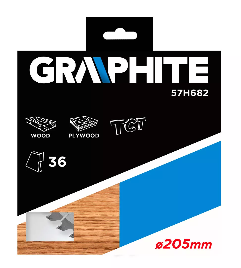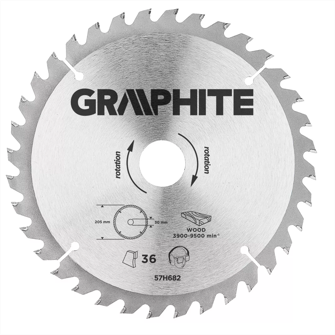 Tarcza do pilarki widiowa GRAPHITE (nr ref. 57H682) o średnicy zewnętrznej 205 mm, wykonana ze stopu stali manganowej MN65 o dużej odporności na temperaturę i odkształcenia. Zęby z nakładkami z węglika spiekanego YG6A pozwalają na zgrubne cięcie drewna i materiałów drewnopochodnych, takich jak sklejka, płyta wiórowa, MDF. Zawarte w opakowaniu pierścienie redukcyjne umożliwiają zastosowanie tarczy do większości modeli pilarek.