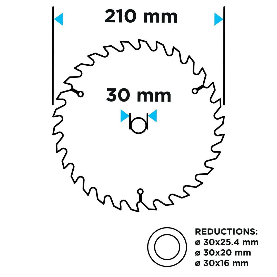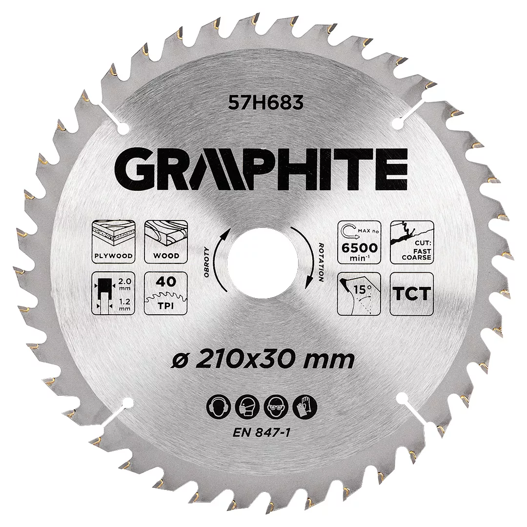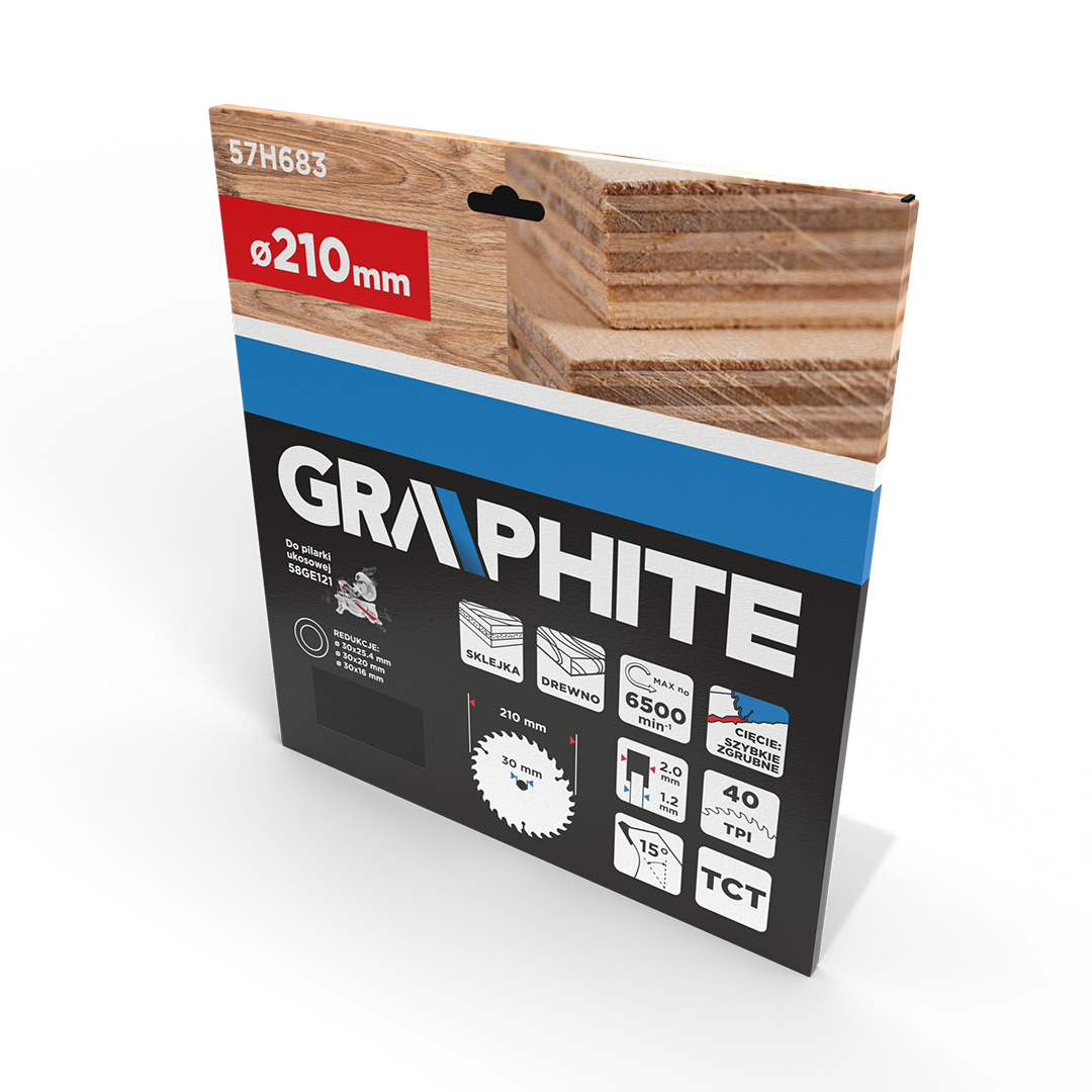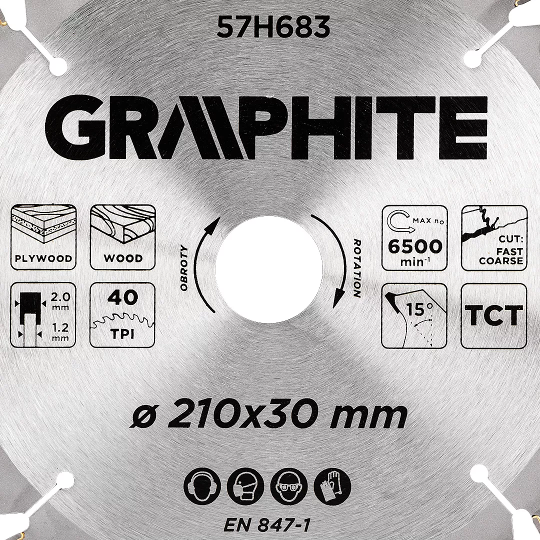 Tarcza do pilarki, widiowa, 210 x 30 mm, 40 zębów 57H683 marki GRAPHITE to akcesorium przeznaczone do pracy ze sklejką i drewnem, o średnicy 210 mm oraz z otworem wewnętrznym 30 mm. Wyposażone w 40 solidnych zębów z TCT. Grubość tarczy wynosi 1,2 mm, a szerokość zęba to 2 mm. Posiada funkcję fast cut oraz maksymalną prędkość obrotową 6500 min⁻¹. Tarcza marki GRAPHITE przeznaczona jest do pilarki o numerze 58GE121. Oferowana w zestawie z redukcjami 25,4/20/16. Polecana zarówno do profesjonalnych jak i amatorskich zastosowań.