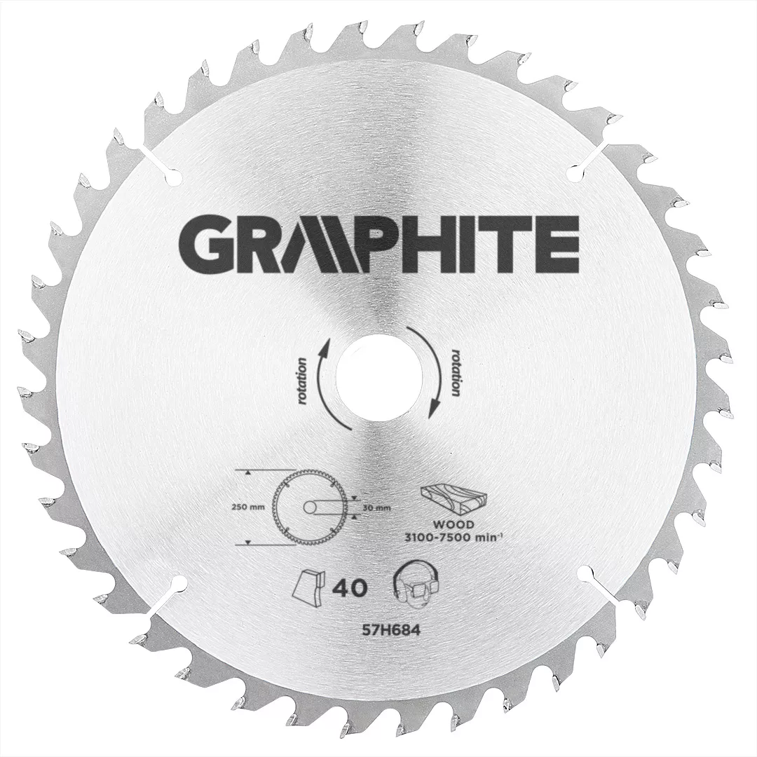 Tarcza do pilarki widiowa GRAPHITE (nr ref. 57H684) o średnicy zewnętrznej 250 mm, wykonana ze stopu stali manganowej MN65 o dużej odporności na temperaturę i odkształcenia. Zęby z nakładkami z węglika spiekanego YG6A pozwalają na średnio dokładne cięcie drewna i materiałów drewnopochodnych, takich jak sklejka, płyta wiórowa, MDF. Zawarte w opakowaniu pierścienie redukcyjne umożliwiają zastosowanie tarczy do większości modeli pilarek.